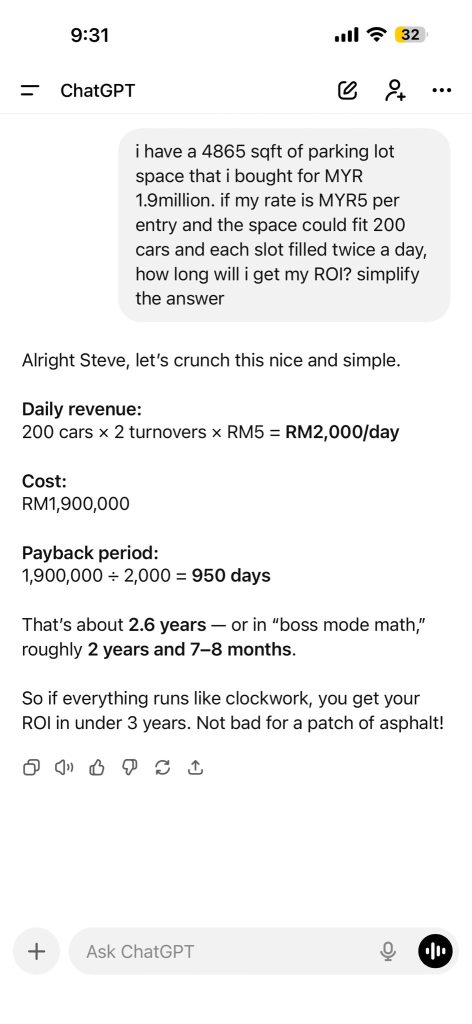 Menurut kiraan netizen itu berdasarkan bantuan chatgpt, jika ada 400 kereta memasuki parking tersebut dalam sehari dengan bayaran RM5 sekali parking, maka pendapatan harian adalah RM2,000 sehari. Jika dalam sebulan, boleh jadi dalam RM60,000. Selama 950 hari atau 2 tahun setengah owner tersebut sudah boleh mengambil balik modal pusingan sebanyak RM1.9 juta. Jika ada mana-mana pembeli yang mahu membeli untuk membuat kawasan parking, amatlah disyorkan.