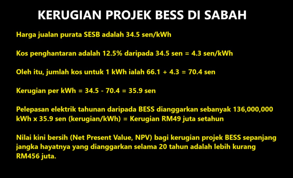 Menurutnya, kos operasi bagi projek di Terengganu dilaporkan berjumlah RM9.412 per kWh setahun, justeru persoalan turut dibangkitkan mengenai kos operasi dan kadar tarif yang akan dikenakan bagi projek BESS di Sabah.