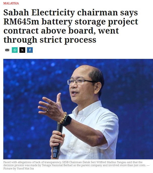 Semua keputusan projek BESS diputuskan oleh TNB dan Kerajaan Pusat. Pengerusi SESB Datuk Madius Tangau pun ketika itu mengambil maklum dan memuji-muji Projek BESS bernilai RM645 juta adalah telus dan sah, serta telah melalui proses pemilihan yang ketat. Beliau menafikan dakwaan kurang ketelusan atau ‘mark-up’,