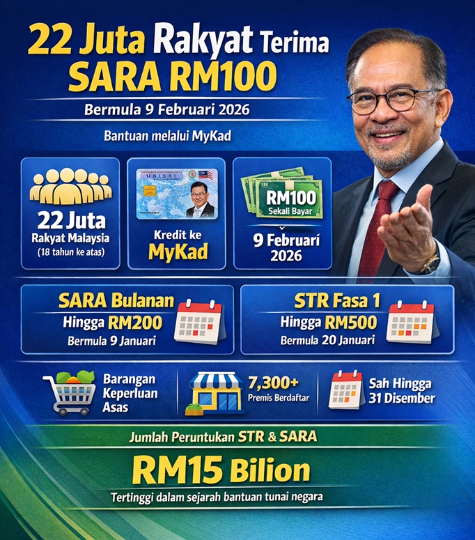 KUALA LUMPUR — Seramai 22 juta rakyat Malaysia berusia 18 tahun ke atas akan menerima bantuan Sumbangan Asas Rahmah (SARA) berjumlah RM100 yang akan disalurkan menerusi MyKad masing-masing bermula 9 Februari ini.
