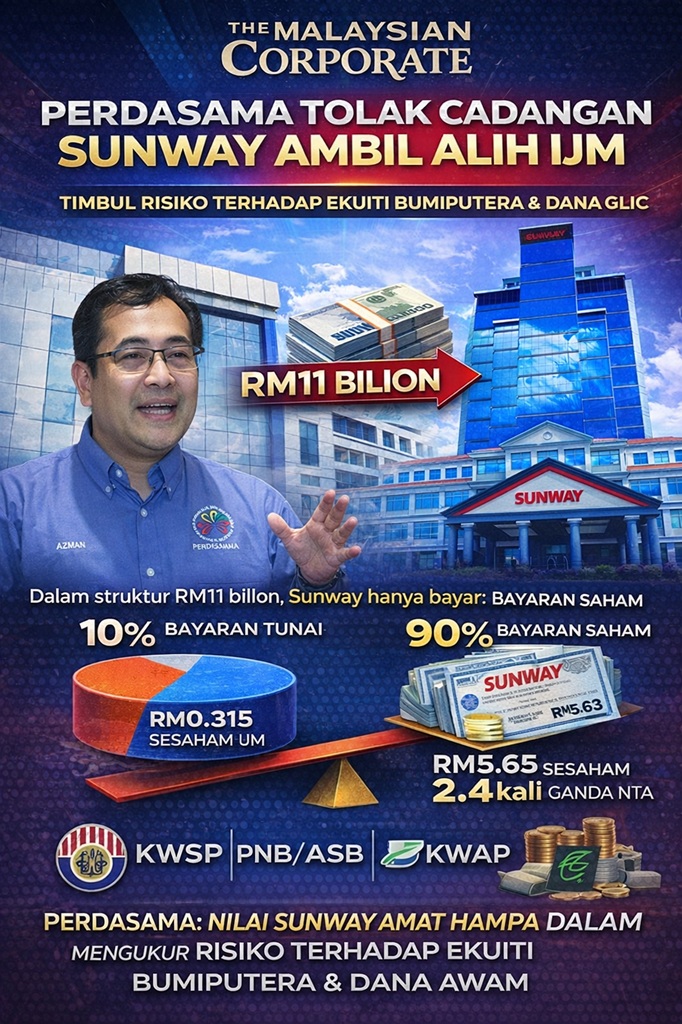 KUALA LUMPUR — Cadangan pengambilalihan IJM Corporation Berhad oleh Sunway Berhad terus mencetuskan kebimbangan dalam kalangan pemerhati pasaran dan badan perniagaan Melayu, apabila Persatuan Pedagang dan Pengusaha Melayu Malaysia (PERDASAMA) secara rasmi menyatakan pendirian menolak cadangan transaksi tersebut atas alasan ia berpotensi menjejaskan ekuiti Bumiputera serta dana awam yang diamanahkan kepada institusi pelaburan milik rakyat